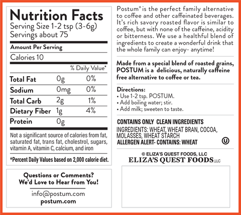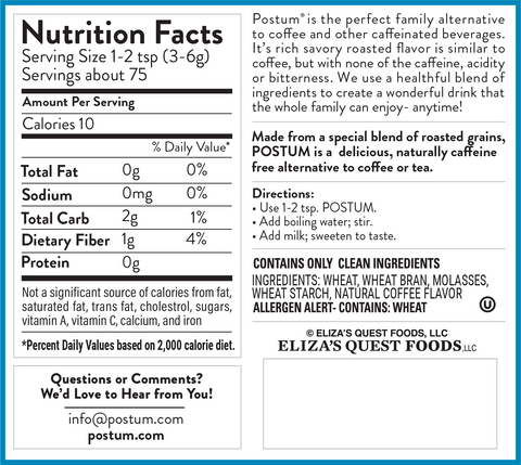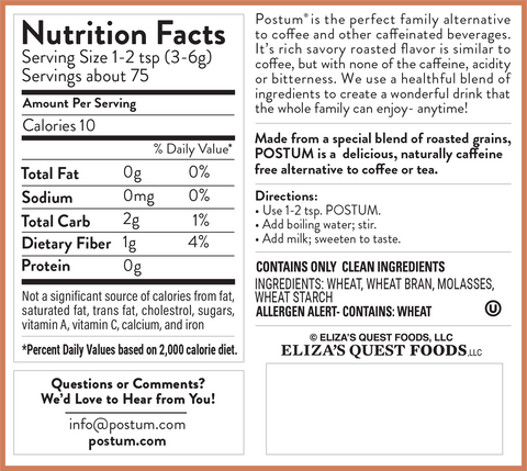 Exciting news, fellow Postum® enthusiasts – your beloved coffee alternative is back, and it's better than ever! That's right – the heartwarming, timeless classic that's been a cherished part of families for over a century has returned, complete with its original recipe. And trust us, it's every bit as delightful as you remember. This wonderful coffee substitute still boasts that incredibly smooth, toasty taste that has won your hearts. The magic is in the simplicity of its ingredients: just the goodness of wheat grain and the sweetness of molasses. And yes, you guessed it – it's still 100% free of caffeine, so feel free to sip away, any time of day.