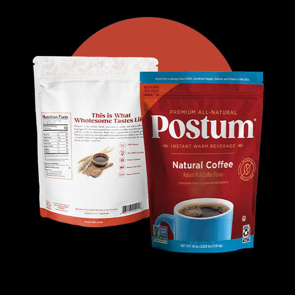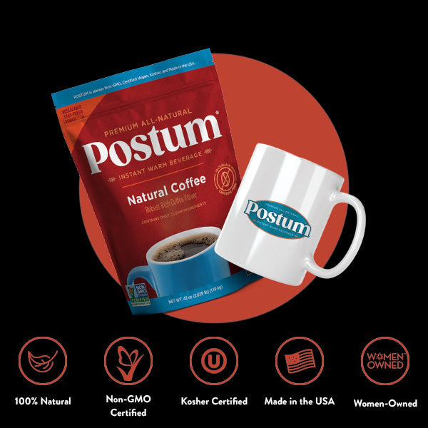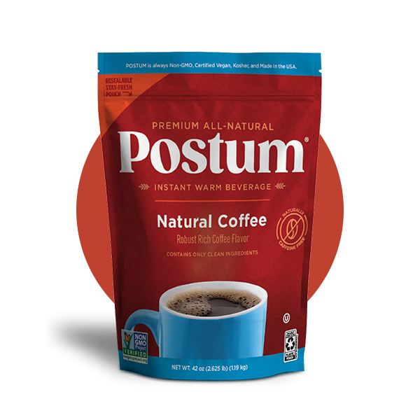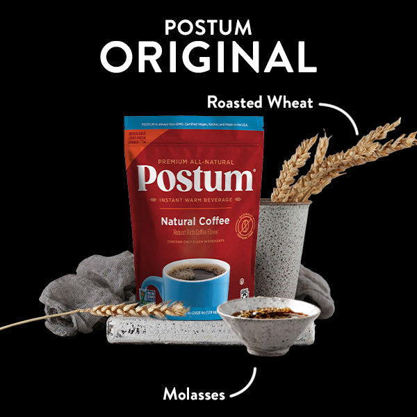 Postum is an all natural instant coffee alternative made of clean ingredients: roasted, wheat , wheat bran, molasses and wheat starch. It is easy to mix. Just use 2 teaspoons per eight ounces of water stir and enjoy. Add a little sweetener and milk and enjoy this delicious caffeine free beverage that is vegan, non-GMO and Kosher.