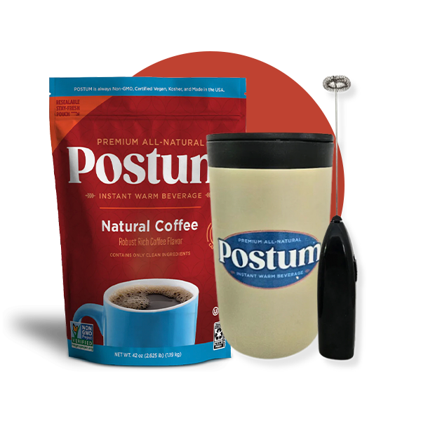 Enjoy a bold, coffee-like taste without the caffeine. Made from roasted wheat, wheat bran, molasses, and wheat starch. Vegan, non-GMO, and Kosher. Use 2 teaspoons with 8 oz of hot water, stir with the frother, and sip from your Postum mug.